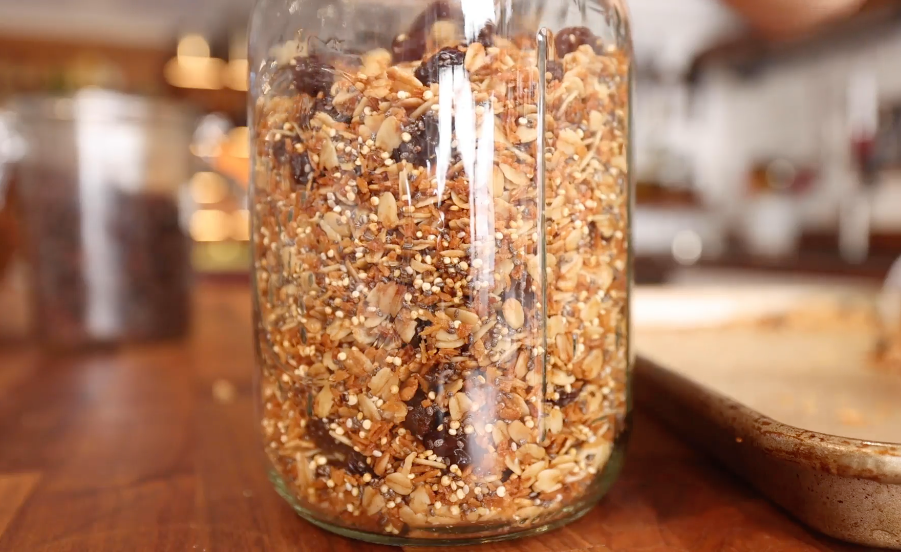 - Take it out and cool it down on a sheet pan. Combine about 1/3 cup of raisins and store in an airtight container.