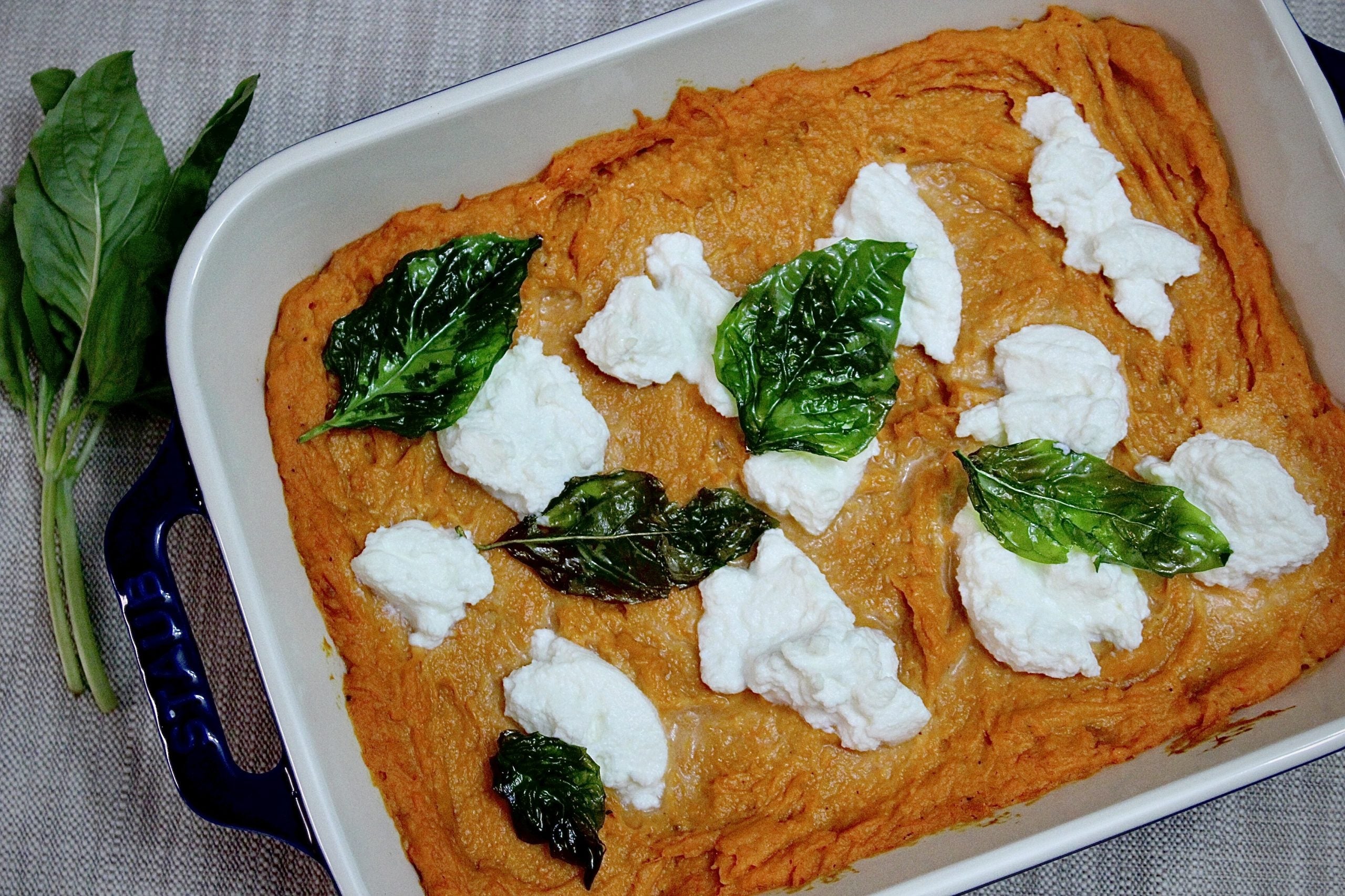 - Scoop puree into an 8×11 (or smaller) casserole dish. Using a teaspoon, place heaping dollops of ricotta across the casserole. Place back into the oven until casserole is heated through (15-20 minutes).