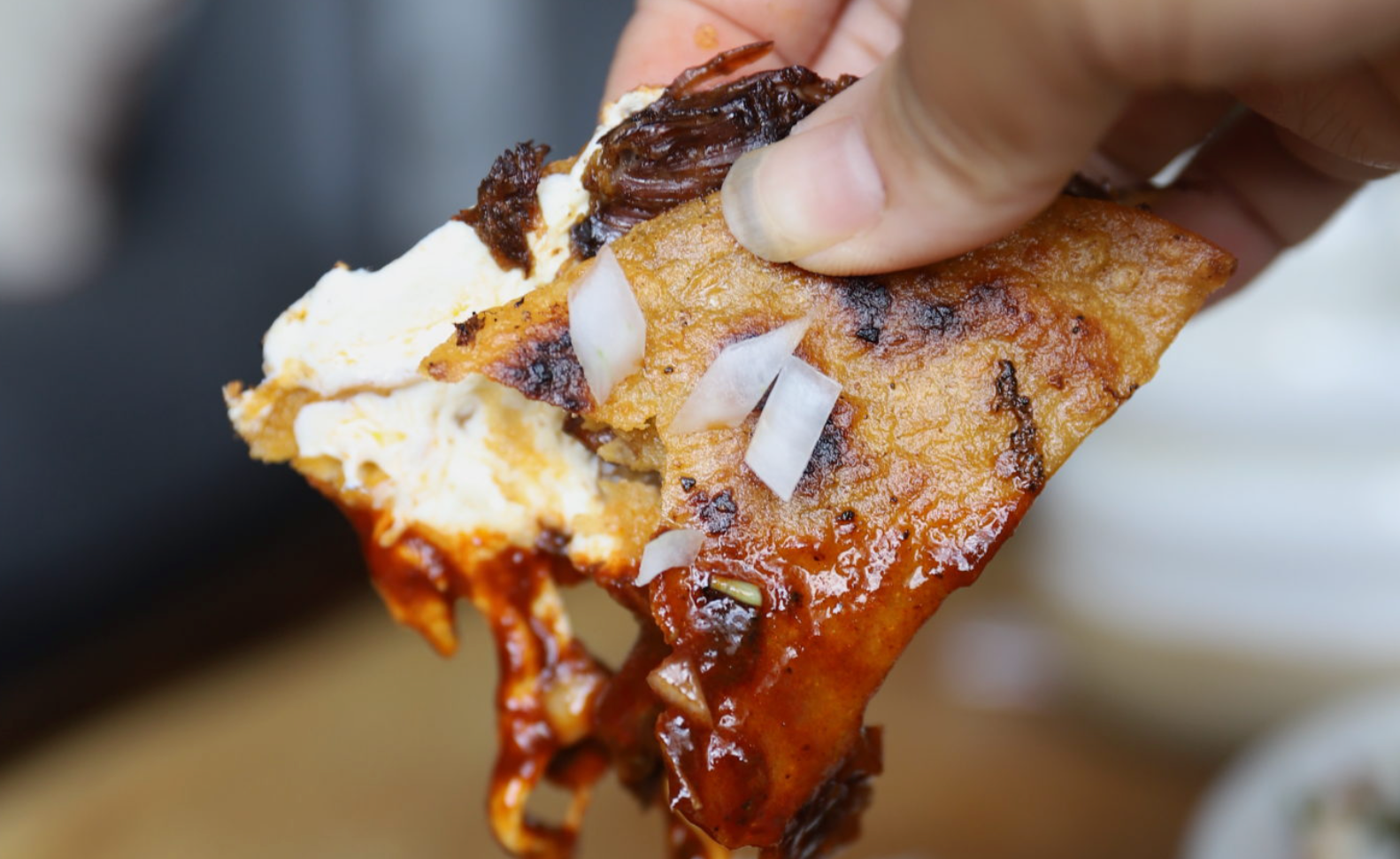Birria tacos start out with the corn tortilla being dipped into a vat of reserved birra fat that stains the tacos bright red that you can see a mile away. Next, it’s placed on a flattop and topped with a generous helping of tender birria meat and a handful of shredded good quality melting cheese, preferably oaxacan aka quesillo cheese. The tortilla warms up and gets nice and crispy on the edges, the cheese gets all ooey gooey, and then it gets topped with diced onion and roughly chopped cilantro for a touch of freshness. Off to the side, you’ll have a cup filled to the brim of birria consomme for dipping purposes. This taco is not your average lackluster taco. It’s got attitude, color, flavor, and its ready to rock your world.
