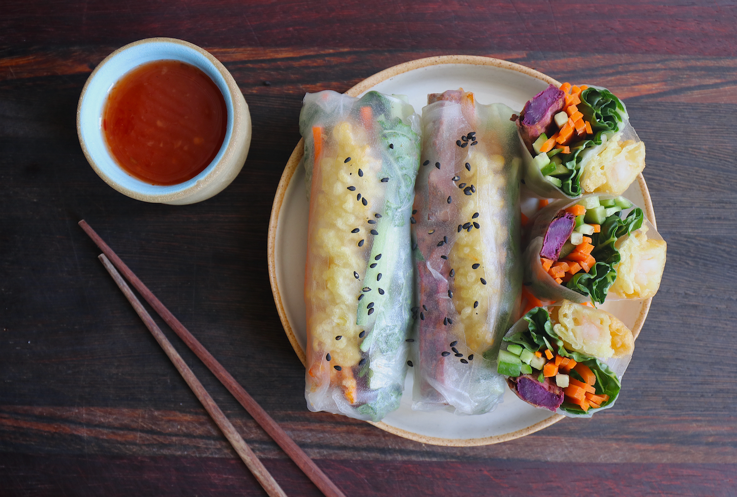 - Dip your rice roll wrapper in some cold water and lay down on your cutting board. Place the bok choy leaves down followed by sliced carrots, sliced cucumbers, and purple potato fries, scallions, and shrimp tempura,
