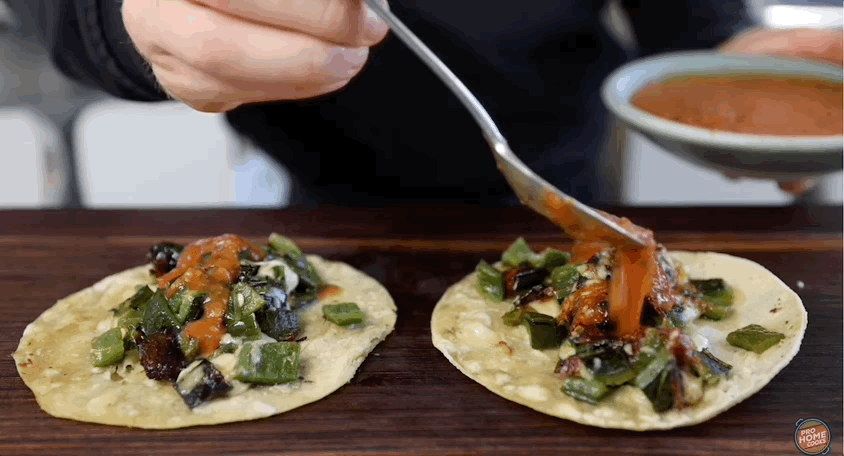 - Take out the tortillas and top with the poblano cheese mix. Then finish with the salsa.