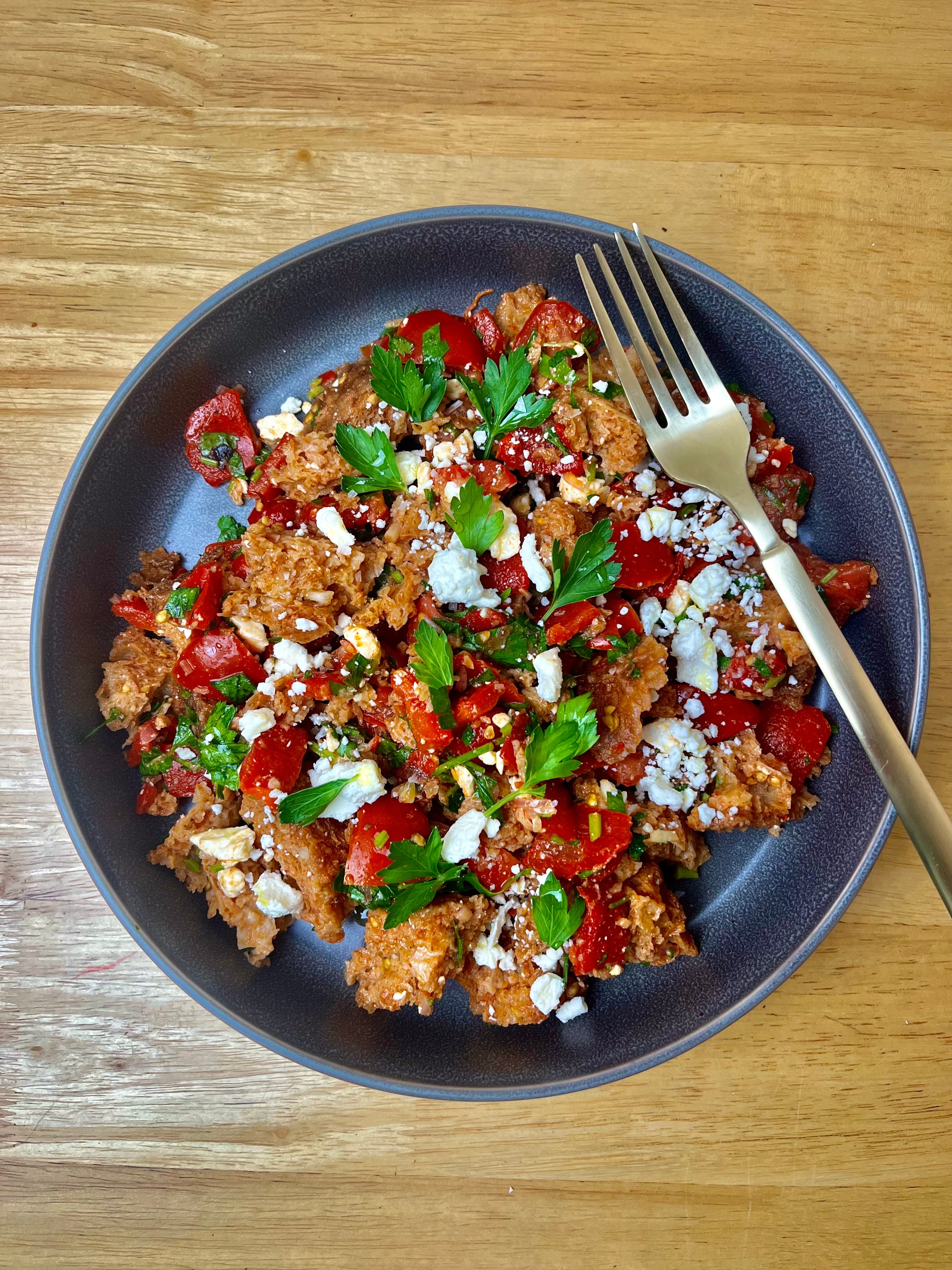 While a “traditional” Panzanella is close to perfection on its own, I tried infusing the flavors of another favorite tomato-bread dish just for fun. Shakshuka! Shakshuka is a popular dish in north Africa and the Middle East, made of spiced stewed tomatoes, usually topped with eggs and served with bread. It’s warm, spicy, cozy, and delicious. However, in months where tomatoes are best served untouched by heat, why not put these flavors into a salad form? I highly suggest you try this fun take on a panzanella, whether as a change of pace or to act as a side dish for a meal that might lean more Middle Eastern than Italian.
