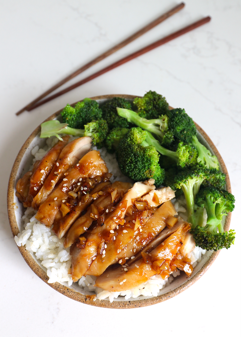 The sauce only consists of three ingredients, freshly minced garlic, honey, and soy sauce. While reducing the sauce down into a sticky saucy glossy teriyaki replica, the chicken gets tossed back into the pan to finish cooking. I serve everything over some freshly made white rice and some broccoli! Made in just a few minutes, you have a balance sweet and savory broccoli and garlic chicken dish.