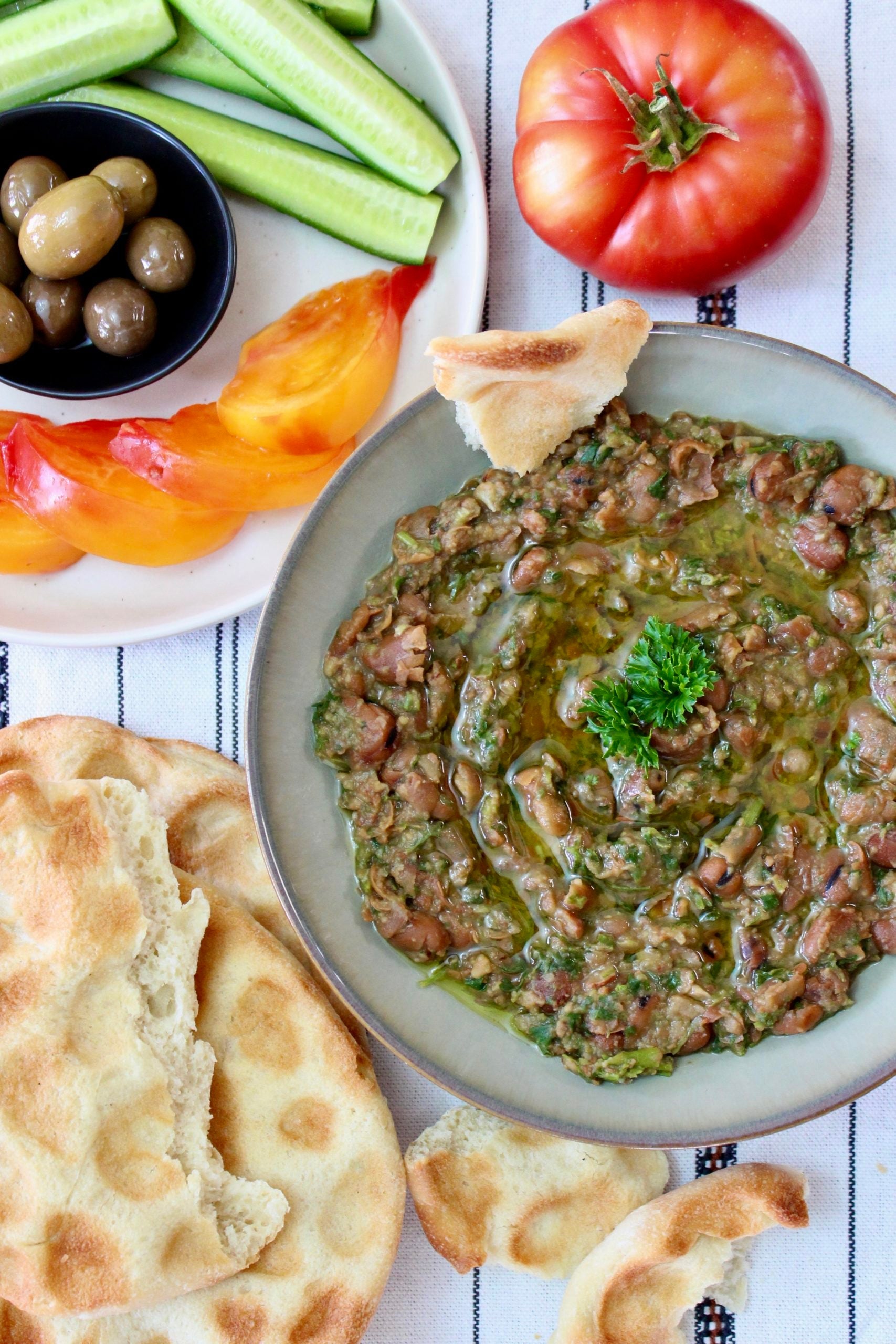 - Serve with warm flatbread, olives, fresh and pickled vegetables, eggs, etc.